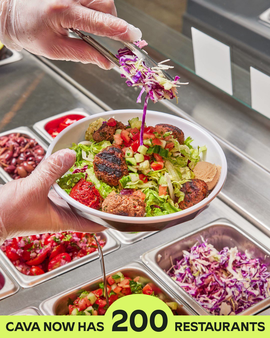 Guests move down the line, Chipotle-style, as Cava employees mix and match salad bar selections. Each step of the way, options range from base ingredients like baby spinach and romaine, to enhancements and proteins, like hummus, tzatziki, grilled chicken, falafel, braised lamb, broccoli, salt-brined pickles, and dressings such as balsamic date vinaigrette and yogurt dill.